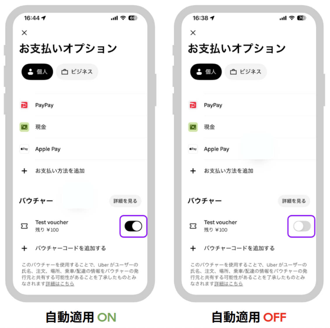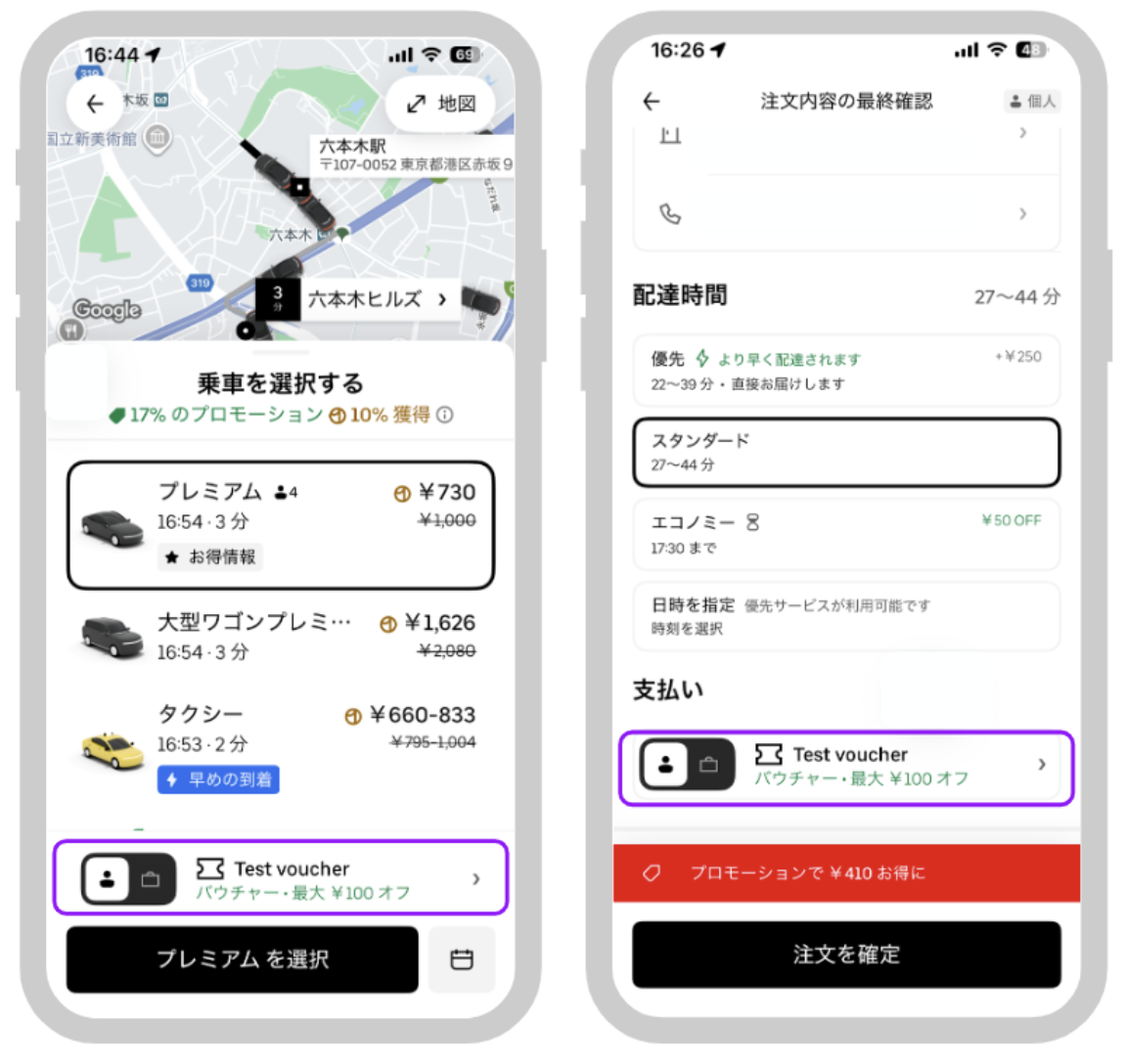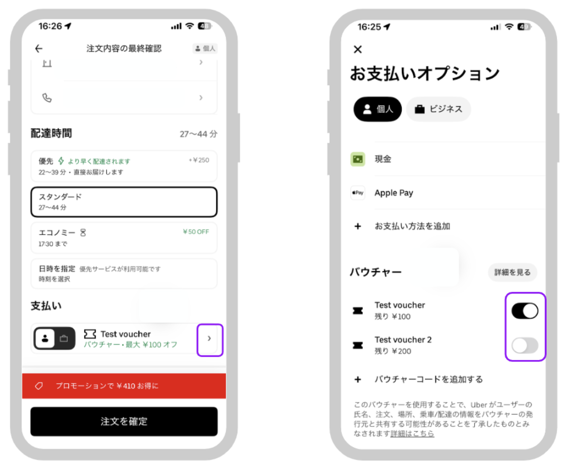 アプリに登録済みのバウチャーは自動で適用されます。 バウチャーは、有効期限が早いものから自動で適用されます。注文を確定する前に、画面上でどのバウチャーが適用されているかご確認ください。